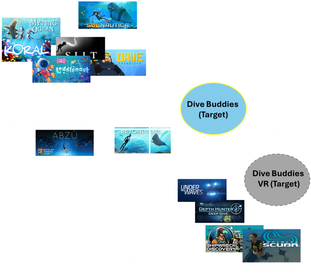 With art focused on simplified expression of realistic environments with physics, the first Dive Buddies will start to fill the obvious gap in the upper right quadrant. While the gameplay will focus on following realistic physics, the aim will be to work through quests – bringing a cozy adventure without the survival and stress of some of the available titles. This will be a simplified, one player experience where it is easy to share accomplishments.